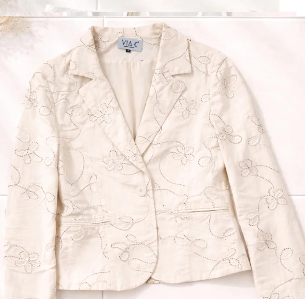 Blazer de lino talle M bordado blanco hueso Elegante, liviano y atemporal. Con delicado bordado floral, solapa clásica y botón frontal. Ideal para elevar cualquier look